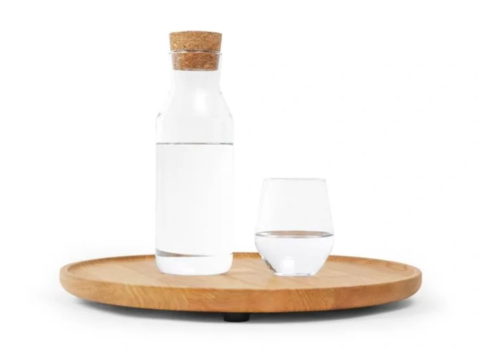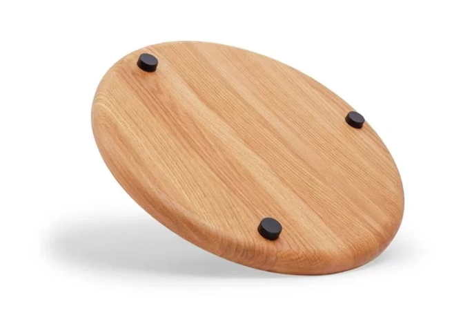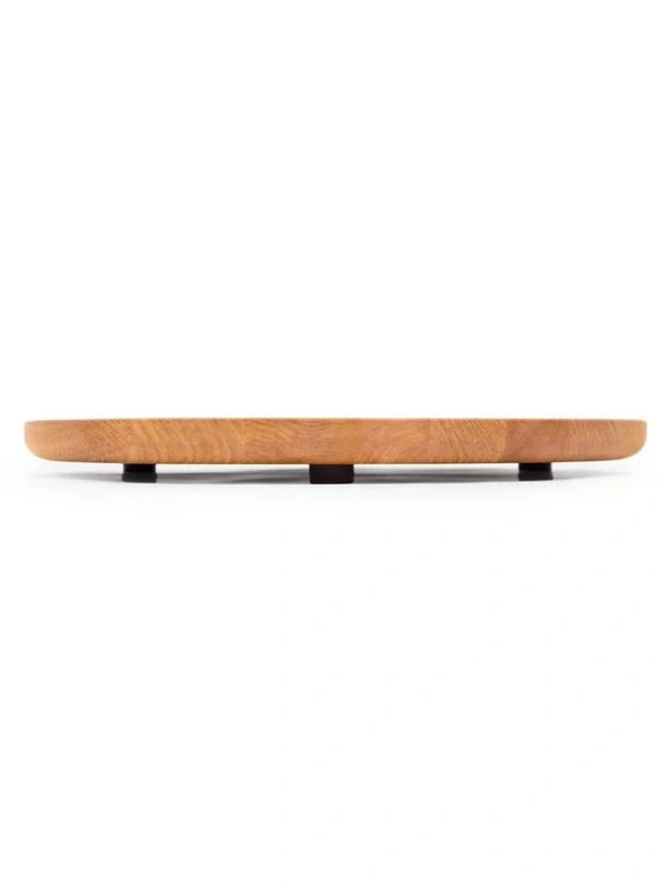 Taca na trzech nóżkach wykonana z drewna dębowego, wykończona warstwą oleju przeznaczonego do kontaktu z żywnością.
